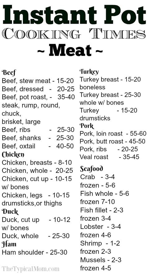 FREE Printable Instant Pot Cooking Times Sheet - Meat